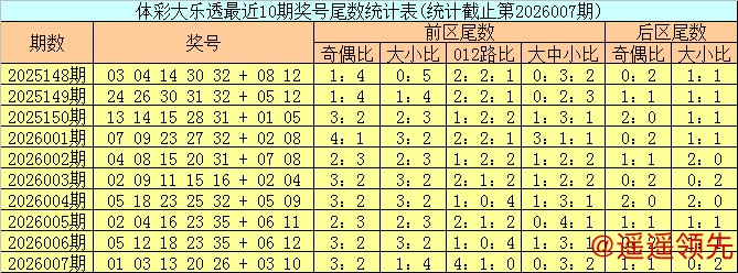 上期回顾:体彩大乐透第2026007期开出号码:01 03 13 20 26 + 03 10,其中前区奖号尾数奇偶比为3:2,大小比为1:4,012路比为4:1:0,大中小比为0:3:2,后区奖号尾数奇偶比为1:1,大小比为0:2。