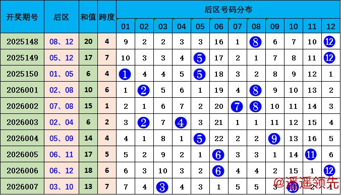 后区走势分析:上期开出03 10,开出和值13,较前一期和值下降5个点位变化,本期预测和值上升,参考号码08 11,和值19。